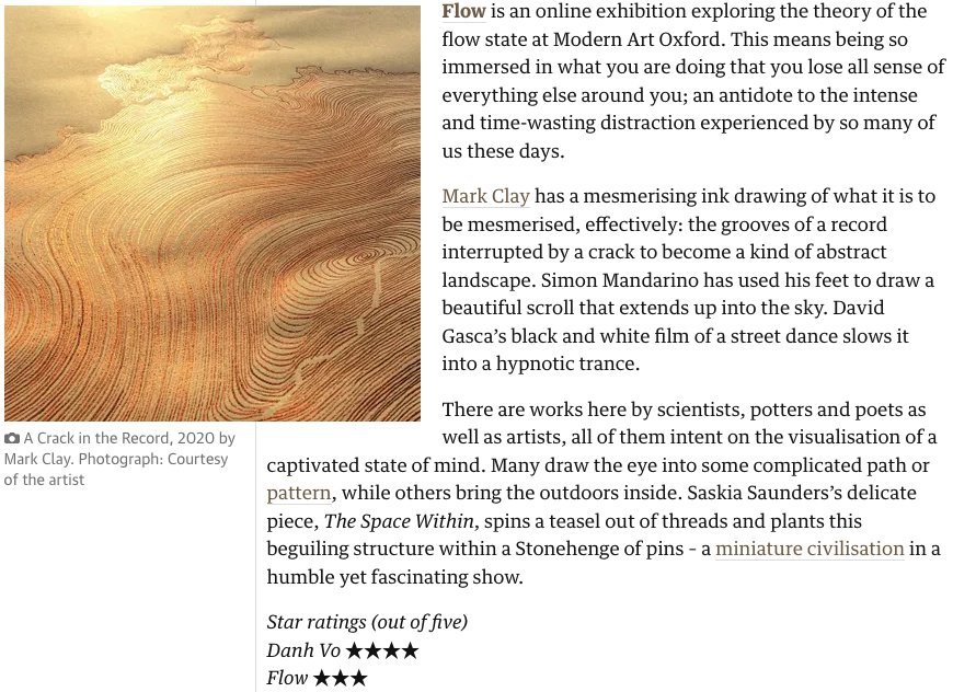 Modern Art Oxford and Oxford Brookes University are proud to present the online project, Flow, the first collaborative exhibition of artists co-curated by Modern Art Oxford volunteers. The exhibited works are selected from a county-wide call out for images, sounds, text and objects that reflect individual experiences of being in creative ‘flow’.